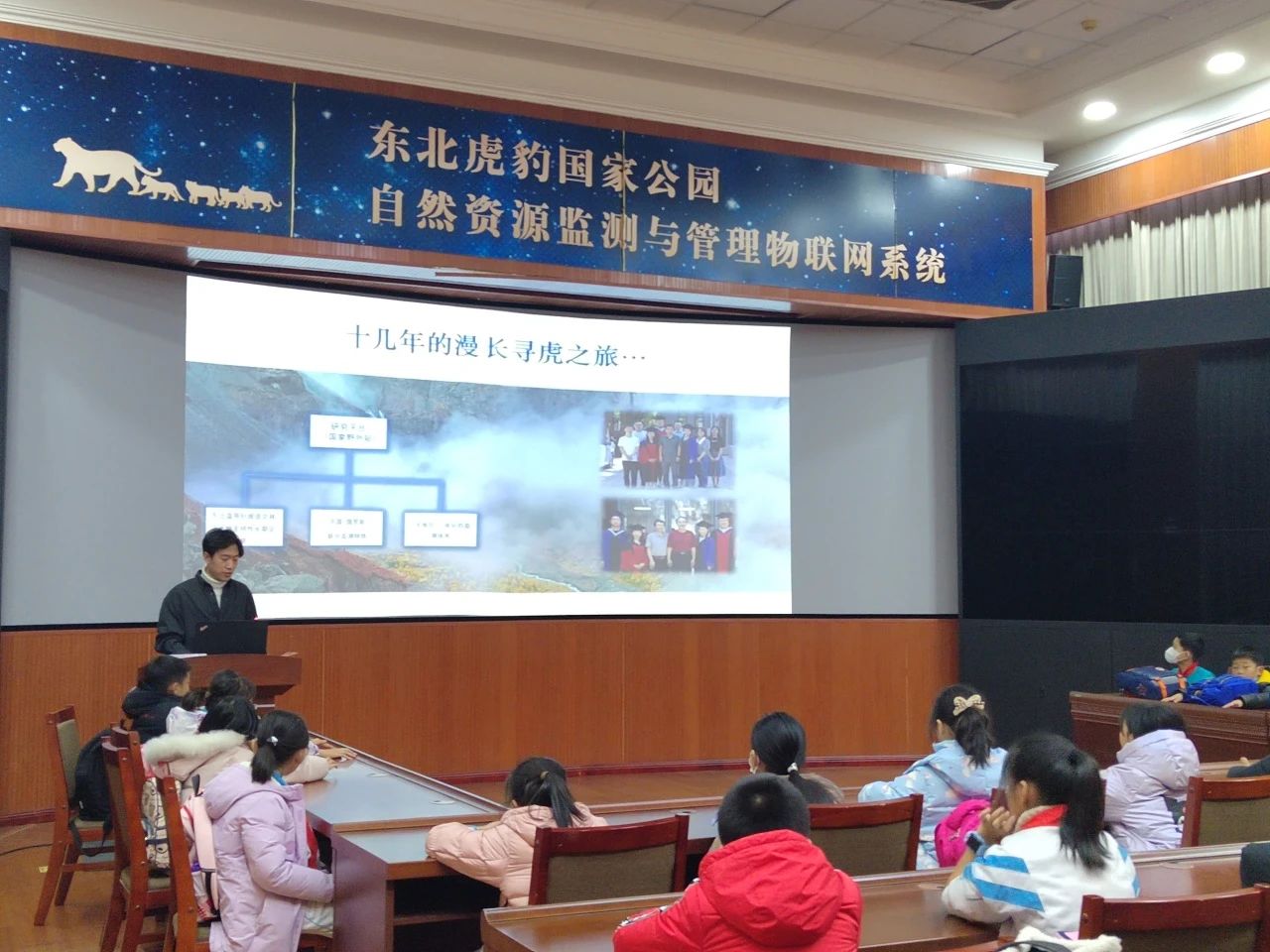 在东北虎豹多样性国家科学观测研究站中,2022级博士党支部的王士政和苏元博两位虎豹研究方向的博士生从东北虎豹的相关知识与东北虎豹观测研究站的作用两方面展开讲解。在此过程中,同学们认真思考相关生物知识、积极回答讲解员的问题、观看东北虎豹的视频影像,收获良多。