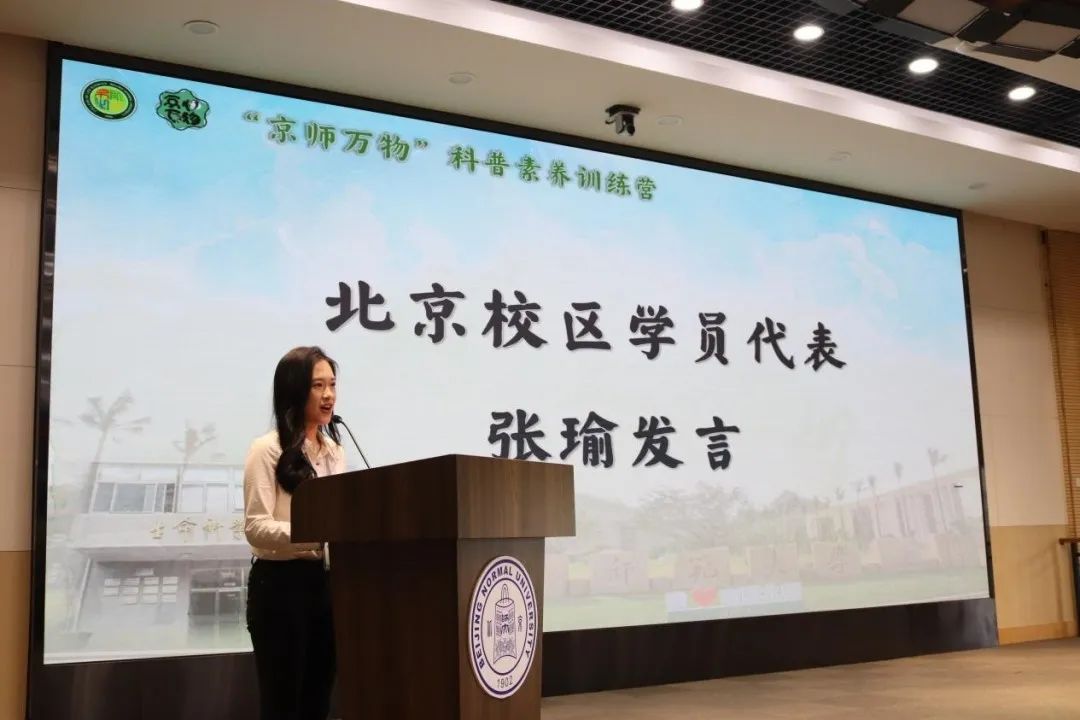 2022级生态学硕士研究生张瑜作为北京校区学员代表发言。她结合过往公益科普经历,从热爱和责任两方面谈及自己对科普工作的认识,并表示自己很珍惜这次京珠联动的交流机会,希望通过参与训练营活动,不断精进专业知识,提升科普素养。