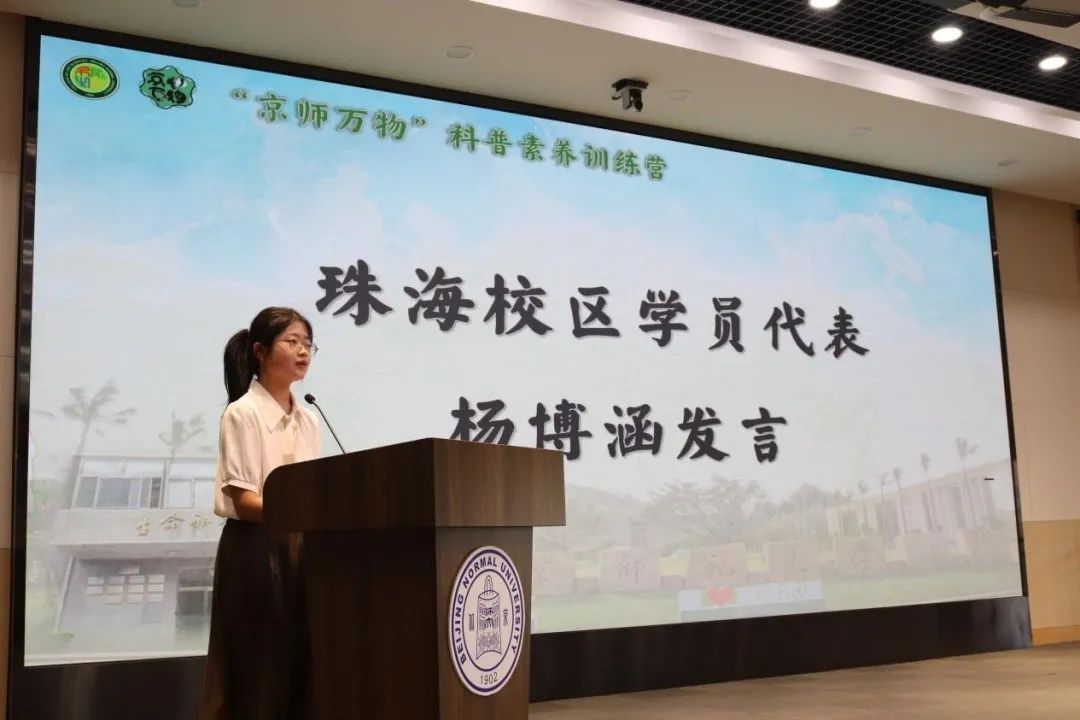 2022级生物科学专业本科生杨博涵作为珠海校区学员代表发言。她讲述了自己对于新时代科学普及工作的理解和期待,表示作为一名师范生她将以提升公民科学素养为己任,将追求科学真理的理想播撒在学生心间,并号召大家怀揣科普热情,加入科普行列,搭建科学与公众的桥梁。