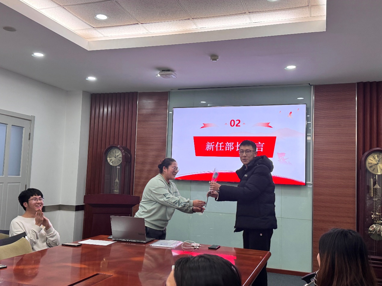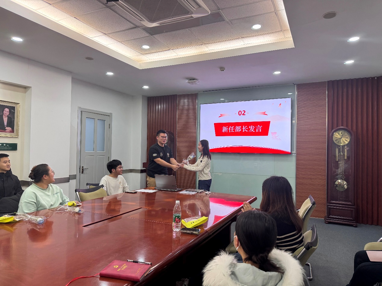 首先,负责人高翔发表讲话,感谢了各位部长这一年来的辛勤付出,各部门团结协作共同完成了多项重大工作,为学院党建做出了举足轻重的贡献。在部长们的带领下,每位部员都对党建中心的职责和使命有了更为深刻的理解,团结在同一面旗帜下为了相同的目标矢志前行。同时,高翔也表达了对新任部长的祈愿,相信大家能够继承前辈们的工作热情,紧密联系在一起,为学院党建工作贡献力量。