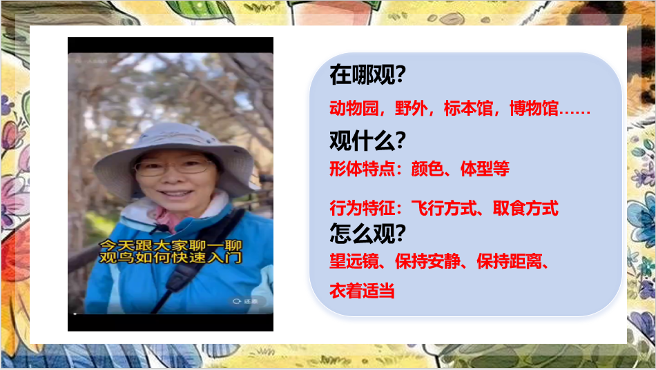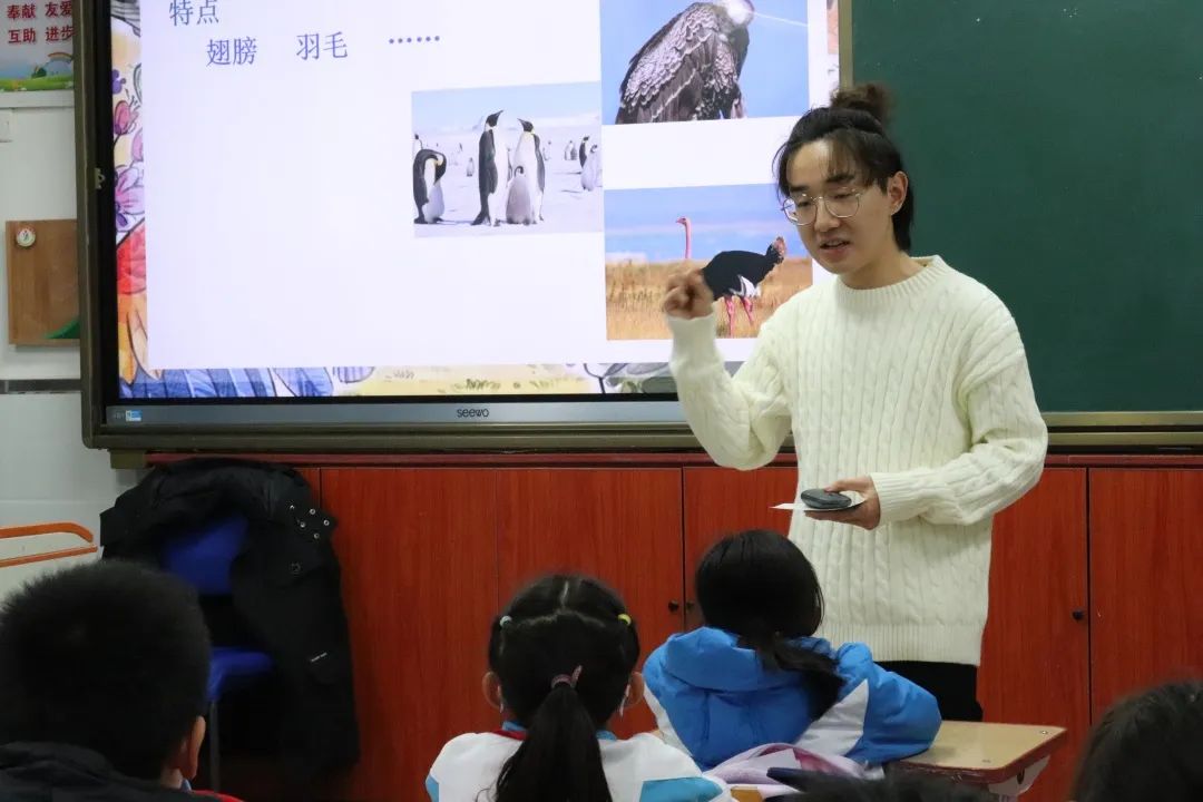 在科普过程中,主讲人们运用生动的图片和音频资料,呈现了各种鸟类的叫声,让同学们更加形象地了解鸟类的六大生态类群。