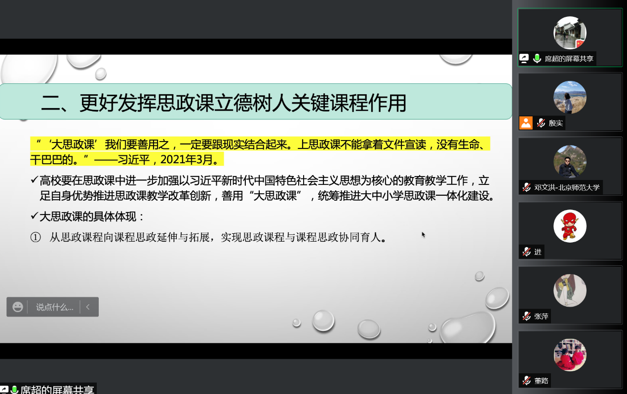 席超传达了习近平总书记在中国人民大学考察时的重要讲话精神,以及中央教育工作领导小组秘书组、教育部党组《关于教育系统深入学习贯彻习近平总书记在中国人民大学考察时重要讲话精神的通知》精神。席超从中国人民大学的历史切入,深刻阐释了习近平总书记讲话对新时代高等教育发展的重要意义,并立足本职工作重点分享了课程思政建设体会。
