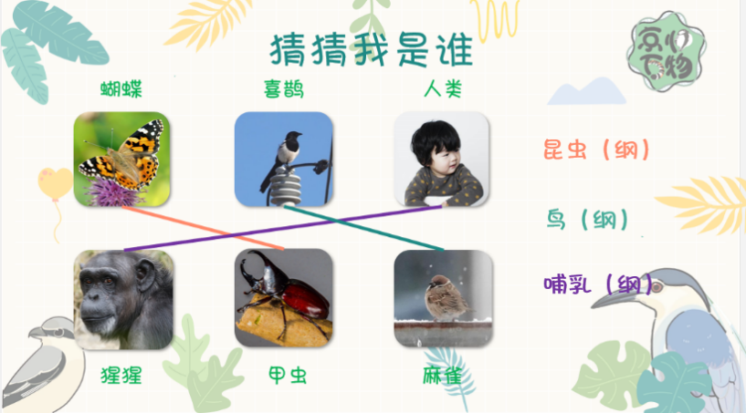 2024年3月14日,“京师万物”科普宣讲团的六名志愿者们前往密云一小分班授课,共为240名四年级的孩子们带来了《动物识别》课程。课程初始,志愿者们通过“猜猜我是谁”“蔬菜战争”两个小游戏,激发孩子们的好奇心并引出动植物分类的意义。课堂上,同学们通过观察不同鸟类、昆虫的特点,总结出了鸟类及其他动物的分类依据。更重要的是,同学们在学习之后明确了动物分类对了解自然和进行科学研究的重要意义。