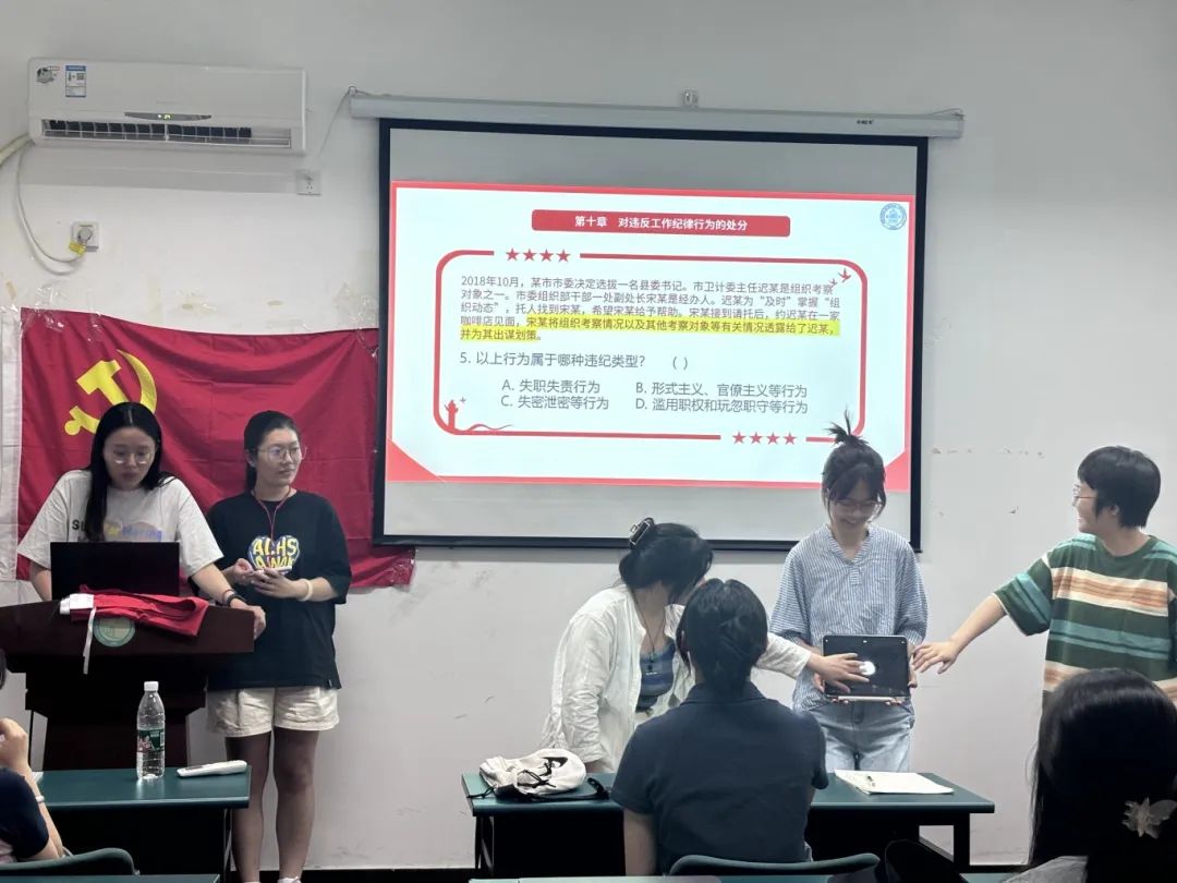 为贯彻落实党中央关于开展党纪学习教育的部署,深入学习领会《中国共产党纪律处分条例》,引导广大党员牢固树立党规党纪意识,坚守纪律底线,2024年6月20日晚20:00,致知党支部于太阳成集团官方网站129会议室组织全体成员开展“学条例,明纪律,守规矩”党纪学习教育主题知识竞赛,党支书罗兴宇同志主持竞赛。