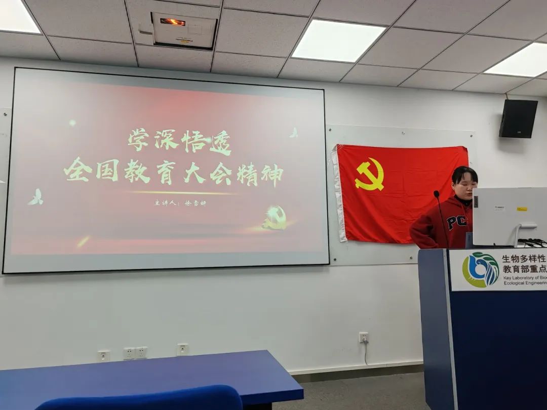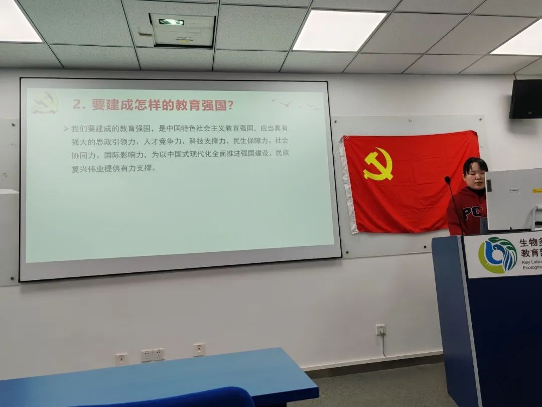2024年10月28日19:00,立身党支部于生态楼A105教室开展了支书讲党课活动。主讲人立身党支部支部书记徐雪妍以“学深悟透全国教育大会精神”为主题进行了党课的讲解。