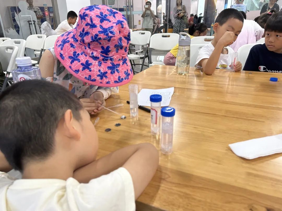 随后,主讲老师通过现场演示,带领小朋友们亲自动手进行实验。在实验过程中,小朋友们按照指导步骤操作,最终惊喜地发现,在正确的操作和实验规范下,他们能够观察到一种白色絮状的物质浮在液体表面。主讲老师告诉他们,这就是草莓的DNA,是他们通过自己的努力亲手提取出来的。