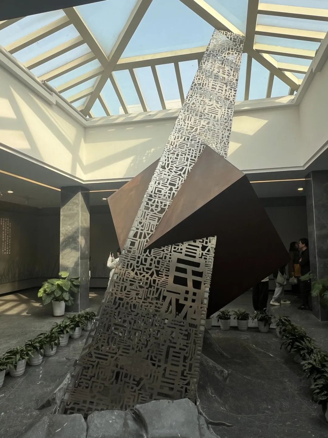 进入展馆,在顶部透光的序厅内,一件巨大的金属雕塑“破土而出”,直冲天际。装置作品采用中空设计,四壁上镂空雕出鲁迅作品中的名言警句,“民族魂”三字清晰可辨。装置中间嵌入一个满是铁锈的正方体,则令人不难想到鲁迅在《<呐喊>自序》中曾冷静地写道,“假如一间铁屋子,是绝无窗户而万难破毁的……”而从整体造型上看,又不难令人联想起他的历史小说《铸剑》(形如长剑),或是他在厦门大学教书期间,指导青年文学团体出版的《波艇》月刊的封面(形如桅杆)。每个观众都可以在这件作品面前,都可以得出自己的解读。