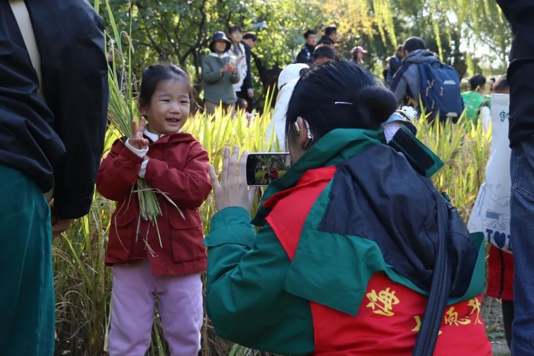 今年的京西御稻收割节以“柳林溪田 金秋稻香”为主题,吸引了许多家庭参与其中。收割节活动正式开始后,参与活动的家庭在志愿者的引导下有序排队领取镰刀等工具,热火朝天地投入到收割劳动中。金色的稻田里洋溢着丰收的喜悦,往来游客络绎不绝,穿梭在稻田之中。志愿者们也严守岗位,各司其职,有的帮助工作人员分发和回收镰刀、整理码放稻子,有的帮助维持现场秩序、提醒游客们注意安全,有的热情地为游客们解答疑问,活动秩序井然地开展着。
