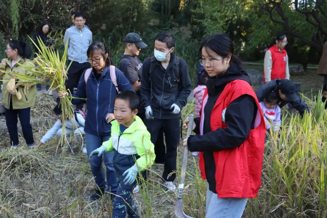 稻田里充满了孩子和家长们的欢声笑语,气氛十分活跃,时时能听到父母通过收割体验对孩子们进行珍惜粮食、尊重劳动的谆谆教诲。大家在技术人员的指导下,一手握稻秆,一手握镰刀,穿梭于稻浪之间,一镰一镰地收割成熟的稻子,通过这种原始的收割方式体会“锄禾日当午,汗滴禾下土”的艰辛。