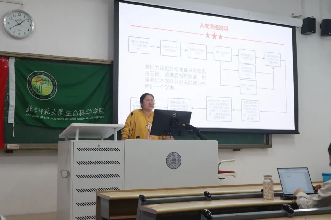 李旭阳同志以流程图的形式进行了入党流程的说明,按照时间顺序对积极分子发展的全流程进行了详细介绍,并对积极分子谈话、共训班修读及二级党校修读中的具体问题进行了说明,同时,对毕业年级的同志的请假问题进行了具体要求。