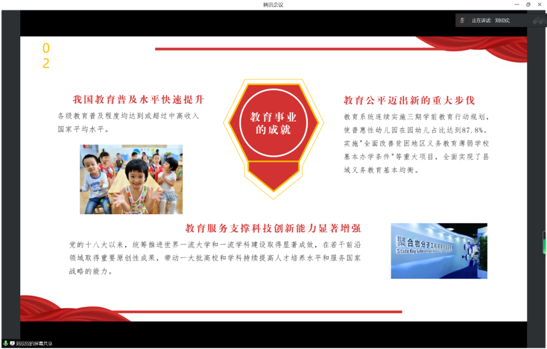 刘欣欣同志以“科技是第一生产力,人才是第一资源,创新是第一动力”为主题,为我们带来了题为《实施科教兴国战略,强化现代化人才建设》的微党课。从科教兴国战略的提出与发展出发,向我们介绍了我国这些年科教兴国战略布局和所取得的成就,呼吁我们青年人也要认识到自己的使命,积极承担责任,为中华民族伟大复兴做出自己的贡献。