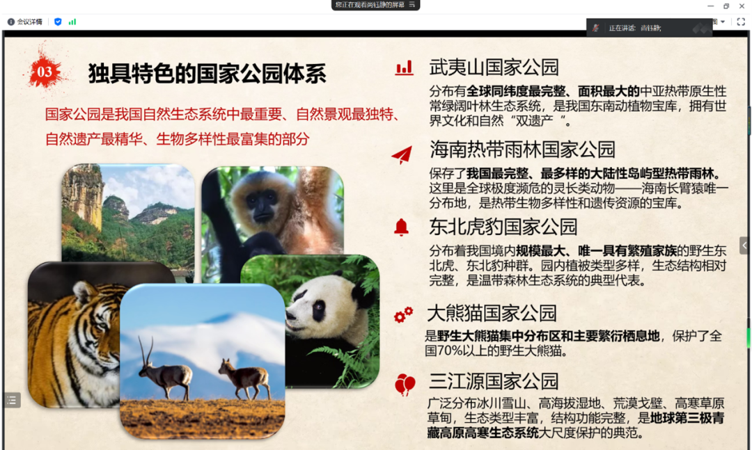 尚钰静同志以“坚持绿色发展,建立美丽中国”为主题,开展了题为《国家公园的前世今生——从国家公园看我国生态文明的发展》微党课。从国家公园出发,介绍了我国生态文明建设的布局、建设经验及未来的发展方向,将专业知识与祖国建设相结合,号召大家将个人发展融入到国家的需要中去。