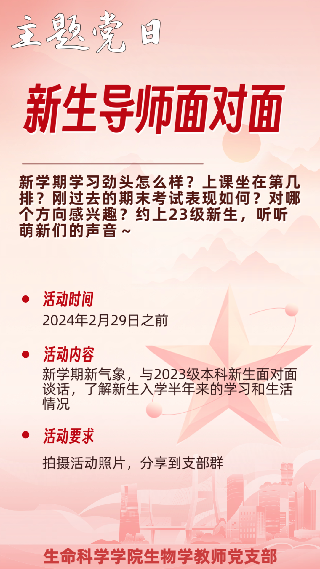 为了学习贯彻学校第十四次党代会精神,扎实落实本科生新生导师制,提高本科人才培养质量,结合太阳成集团官方网站党建业务深度融合的工作部署,生物学系教师党支部创新主题党日活动形式,于新学期伊始组织党员教师与各自负责的本科新生谈心谈话,及时了解学生寒假生活情况、上学期考试成绩、新学期学业压力、学习困惑和思想动态变化等情况。