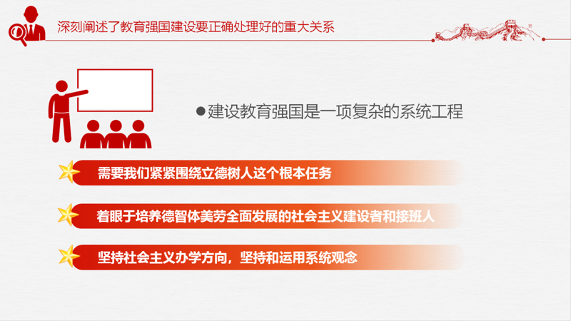 接着,张瑜同志深刻阐述了教育强国建设要正确处理好的重大关系。建设教育强国是一项复杂的系统工程,要正确处理支撑国家战略和满足民生需求、知识学习和全面发展、培养人才和满足社会需要、规范有序和激发活力、扎根中国大地和借鉴国际经验等重大关系,紧紧围绕立德树人根本任务,坚持社会主义办学方向,坚持和运用系统观念,培养德智体美劳全面发展的社会主义建设者和接班人。