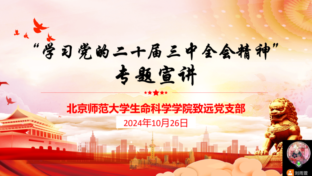 党的二十届三中全会通过的《中共中央关于进一步全面深化改革、推进中国式现代化的决定》提出进一步全面深化改革的指导思想,“习近平总书记关于全面深化改革的一系列新思想、新观点、新论断”是其中最重要的内容。为全面学习贯彻习近平新时代中国特色社会主义思想,深入理解党的二十届三中全会精神,2024年10月26日19:00,致远党支部顺利开展“学习党的二十届三中全会精神”专题宣讲活动。本次宣讲特别邀请到马克思主义学院求索学社宣讲团的樊奕聪、任紫莹两位同志作为主讲人,从不同角度出发为大家详细解读党的二十届三中全会精神。