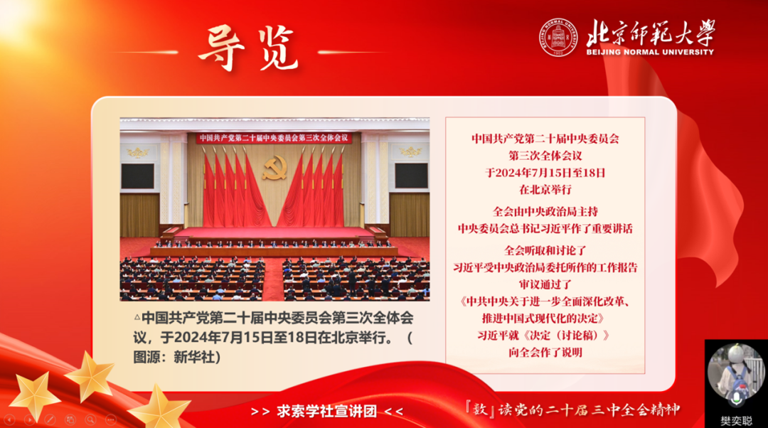 首先,樊奕聪同志介绍了党的二十届三中全会导览,中国共产党第二十届中央委员会第三次全体会议,于2024年7月15日至18日在北京举行。全会最重要的成果是审议通过《中共中央关于进一步全面深化改革、推进中国式现代化的决定》(即《决定》)。《决定》共15部分、60条,分三大板块。为大家勾勒出二十届三中全会的大框架,从总体上为我们介绍二十届三中全会的含义。