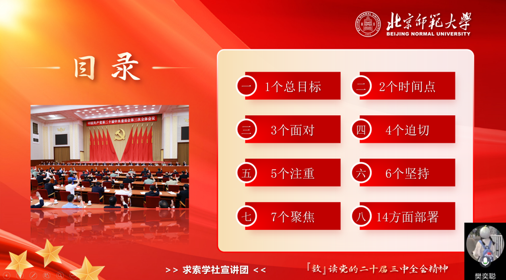 之后,樊奕聪同志又将二十届三中全会涉及的诸多内容细分为八个方面,为大家系统解读二十届三中全会精神的具体体现。樊奕聪同志以习近平总书记在党的二十届三中全会上的重要讲话、重要说明为指导,以“数字”呈现的方式凝练出最具有代表性、典型性、标识性的概念。八个“数”分别为一个总目标、两个时间点、三个面对、四个迫切、五个注重、六个坚持、七个聚焦和十四个方面部署,帮助大家系统了解并全面把握党的二十届三中全会精神。