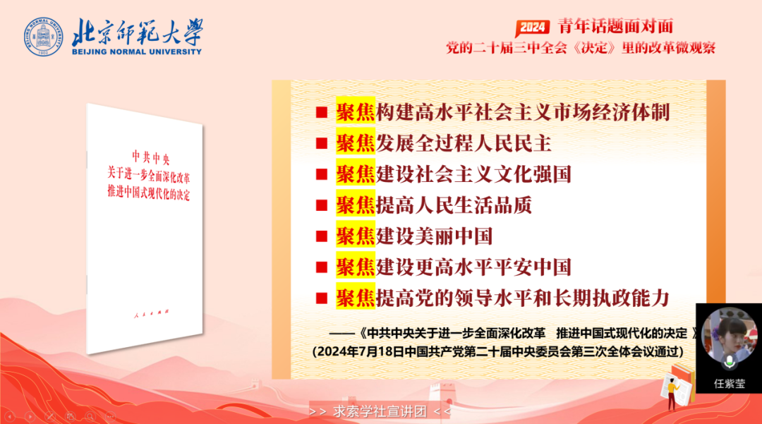 任紫莹同志为大家介绍道,党的二十届三中全会通过的《决定》紧紧围绕继续完善和发展中国特色社会主义制度、推进国家治理体系和治理能力现代化这个总目标,提出“七个聚焦”的改革方向,勾勒出进一步全面深化改革的新蓝图,对谱写中国式现代化崭新篇章具有重大意义。任紫莹同志对“七个聚焦”的解读让我们对党的二十届三中全会通过的《决定》有了具体且深入的了解。