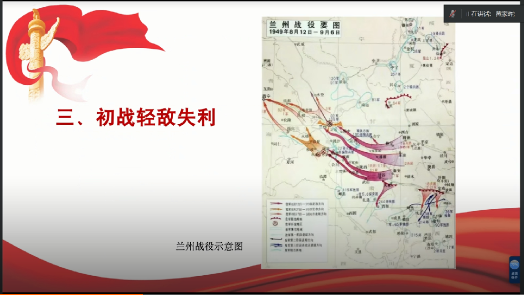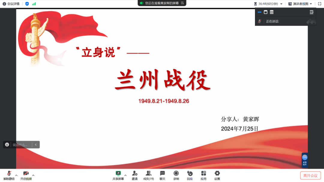 2024年7月25日晚20:00,立身党支部的黄家晖同志于线上开展本学期第七期主题为“兰州战役”的"立身说"红色文化分享活动。