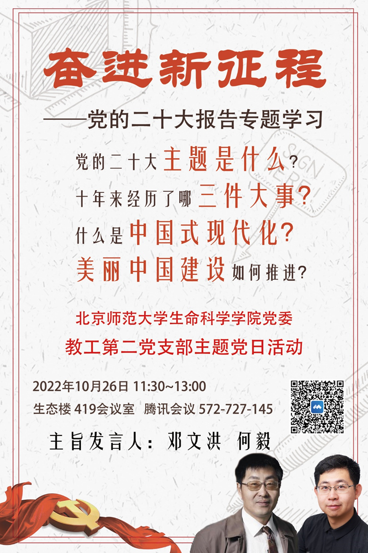 何毅老师首先向参会老师们介绍了党的二十大的主题,重点学习了大会报告的第一、二、三、十部分,了解了二十大报告中提出的“三件大事”“中国式现代化”“党的中心任务”等一系列新观点、新表述,结合生态学专业特点,重点了解了大会报告关于“推动绿色发展,促进人与自然和谐共生”的重大要求。邓文洪老师着重针对大会通过的党章修改内容进行了分享,帮助各位老师进一步了解了新党章究竟新在哪里。邓老师谈到,新修改的《中国共产党章程》首次将“两个确立”写进党章,着重体现了治国新理念、新战略,他结合自身南极科考的经历,为大家讲述了党和国家领导人在战略布局上的高瞻远瞩。随后,与会的各位老师展开了讨论,姚红艳博士、张雁云老师、王天明老师纷纷发言,会议在热烈欢快的气氛中结束。
