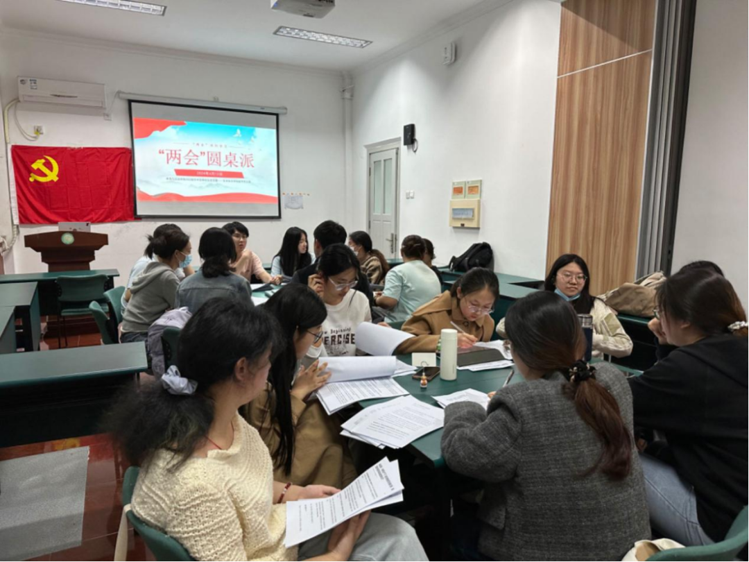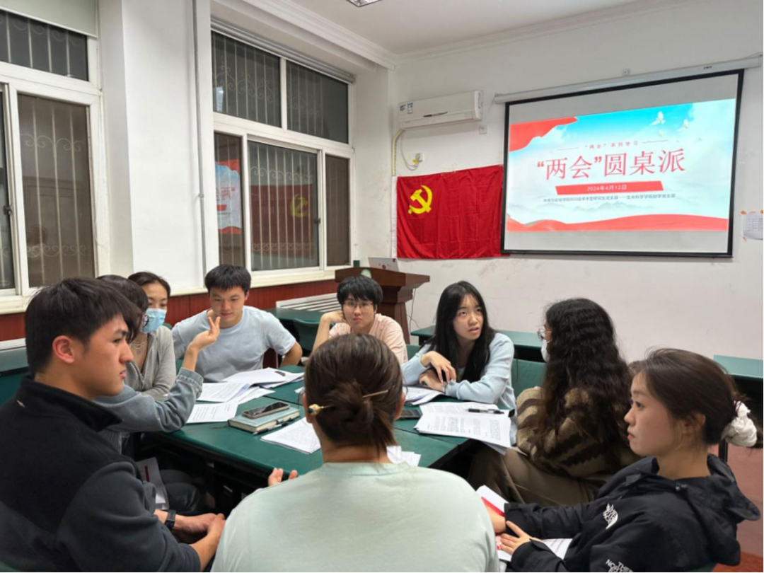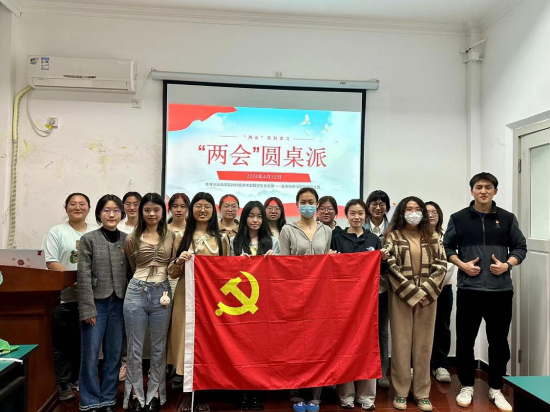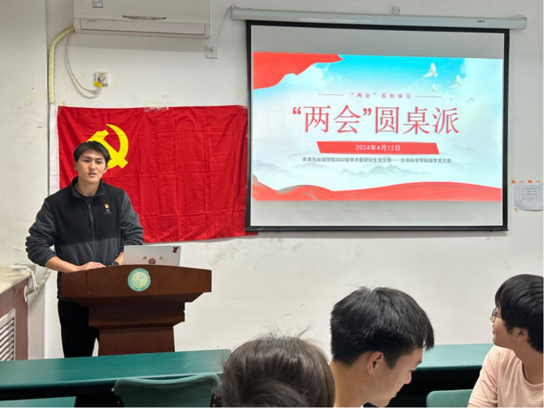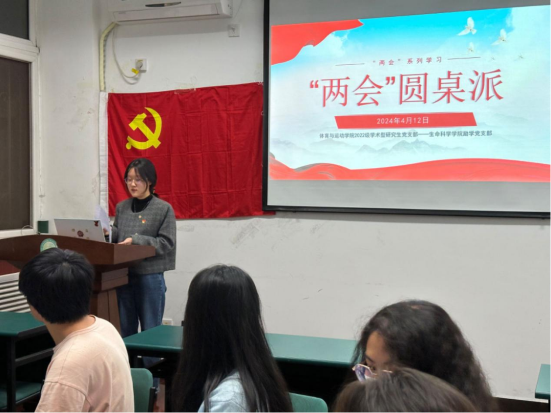 2024年4月12日,太阳成集团官方网站励学党支部和体育与运动学院2022级学术型研究生党支部在生地楼129教室举行“两会圆桌派”,就两会上与体育强国、生物科学相关的话题展开讨论。本次会议由励学党支部杨心爱同志主持。