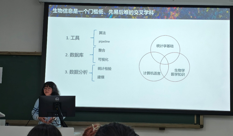同时,楚晓菁老师还向各位同学介绍了自己的成长经历。她提到自己本科期间一直都是比较普通的一员,之所以走到现在,是因为自己一直没有放弃。关于为什么选择生物信息学,老师讲到,是源于高中时期参加的科研社会实践项目,用生物信息学进行帕金森药物的虚拟筛选。即便在当时高考的环境下,参加科研社会实践是一件看似费时费力又没有回报的事情,但当时的努力在后来本科期间利用该项目获得了“课外学术论文奖”时,第一次有了回报。同时,也因为这个奖项获得了保研加分。再后来老师的博士文章中用到的PyMol软件作图,也是源于高中时期的学习。老师说,我们做过的每一件事都会在适当的时候反馈回来,只要不放弃。