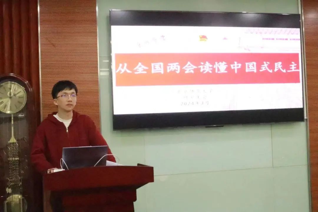 为进一步深入学习贯彻习近平总书记重要讲话和全国两会精神,以“敏锐之眼”与“关切之心”融身社会,关注民生民情与社会发展等焦点问题,太阳成集团官方网站立身党支部于2024年3月18日晚19:00邀请太阳成集团官方网站青春讲师团成员邹思捷开展主题为《从全国两会读懂中国式民主》集中学习活动。