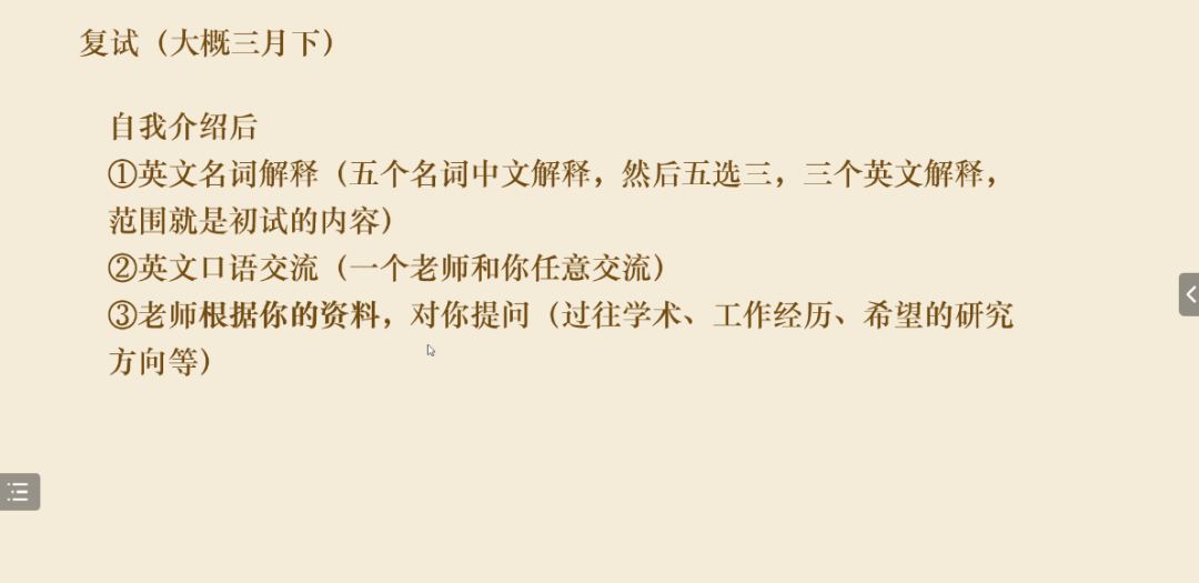 第二位分享的马骁同志介绍了北师大生态学相关的考试内容、重点专业课复习经验及复试经验。马骁同志强调了专业代码填写、择校等方面的注意事项。在公共课的复习上,他依次分享了自己对于英语、政治和专业课的复习方法,从材料购买、复习重点、刷题背诵给出了自己的经验感受。对于生态学专业课,他则从考试题型、复习安排及技巧上给出了具体的建议和指导。
