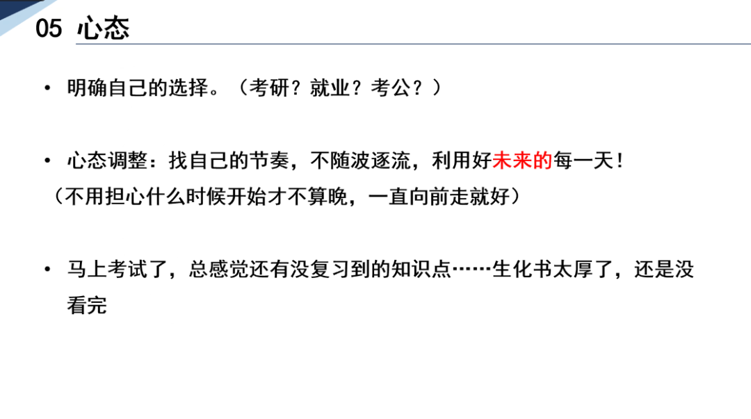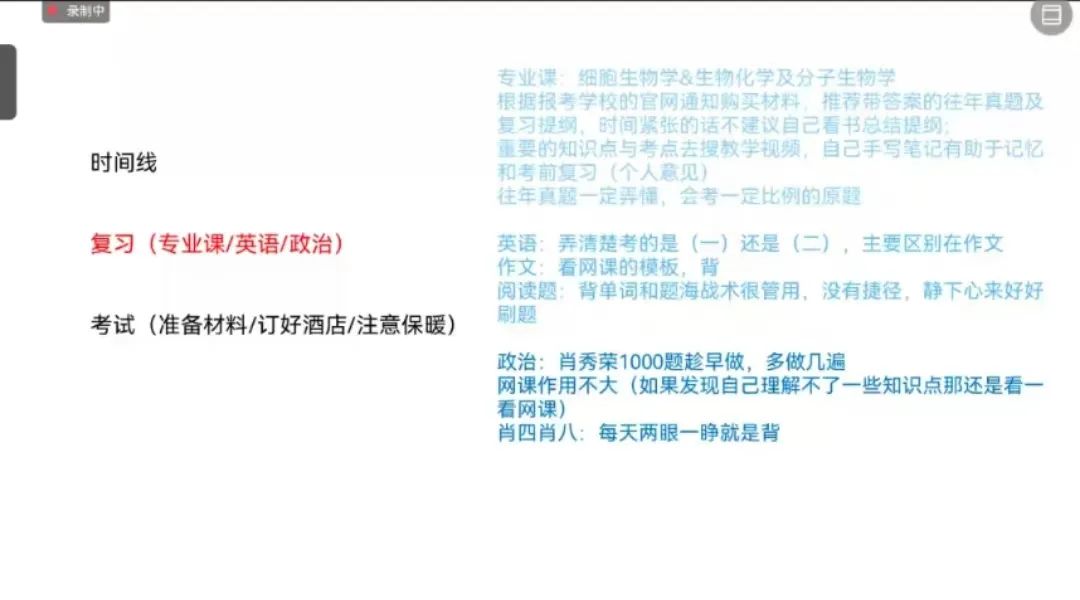 最后,由王一迪同志针对本院生物学研究生的报考,给出了详细的经验分享。在前两位同志分享内容的基础上,对于复习科目的策略、参考材料及部分网课的推荐,王一迪同志给出了自己的补充回答。具体到生物学的两门专业课,她递进拆解了每一轮复习的目标任务和重点难点。同时,在备考心态、时间管理和身体素质上,她也给出了贴心的提醒。