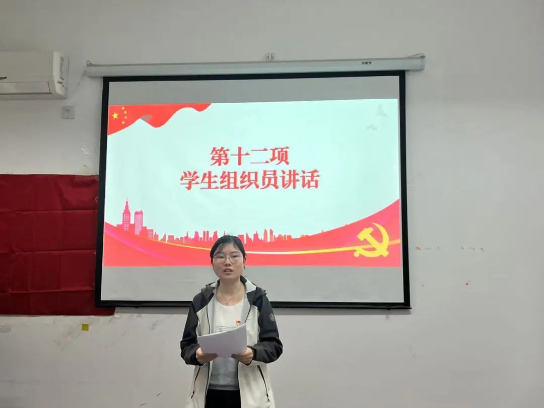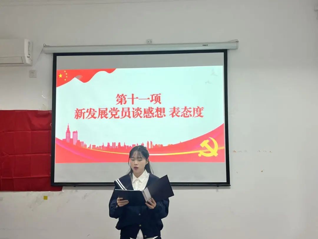 会议第十二项,学生组织员翟桉迪同志讲话,她认为本次发展流程符合规范,同时也对两位新发展党员表达了祝贺。