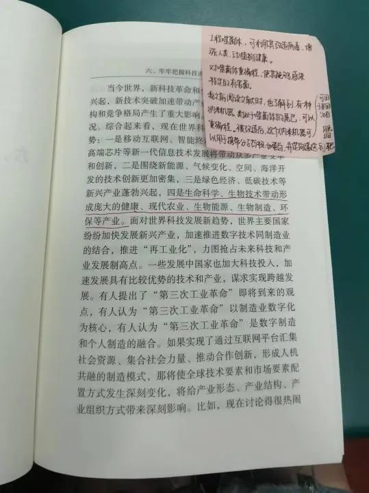 各位同志积极讨论并分享自己的阅读感悟。习近平总书记在书中对“科技创新”做出的许多绝妙比喻给大家留下了深刻的印象,同时,针对书中第六章总书记指出的“综合来看,现代世界科技发展有这样几个趋势:…… 四是生命科学、生物技术带动形成庞大的健康、现代农业、生物能源、生物制造、环保等产业。”同志们纷纷分享自己所了解的生物科学领域的科技创新。