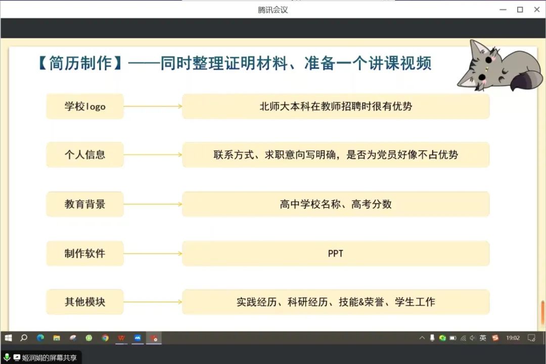 姬润娟同志首先分享了关于简历制作方面的内容,她从学校logo、个人信息、教育背景、制作软件、其他模块五个方面,介绍了一些简历制作的要点。她强调教育背景方面一定要写清高考分数和所就读的高中,把自己的优势写全面,同时不要忘记写清自己的求职意向。