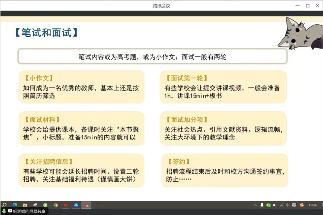 接下来,姬润娟同志分享了求职过程中笔试和面试的经验。她强调在面试的试讲环节中要根据学校所提供的教材资料进行准备,不必准备过多,时间控制在15分钟左右即可,并建议大家注意社会热点、引用文献、新教学理念等面试加分项,并强调了与学校及时确定签约时间的重要性。