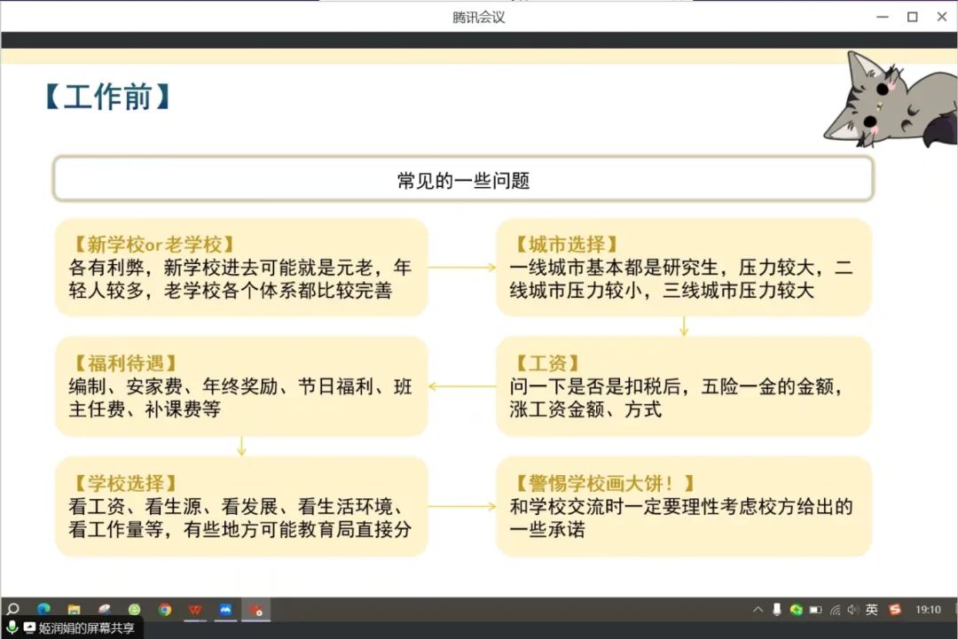 随后,姬润娟同志就工作前的常见问题进行分析,她列举了城市选择、福利待遇、工资、学校选择、理性考虑校方承诺等问题,其中着重分析了学校的选择问题,并阐述了新老学校各自的优缺点。