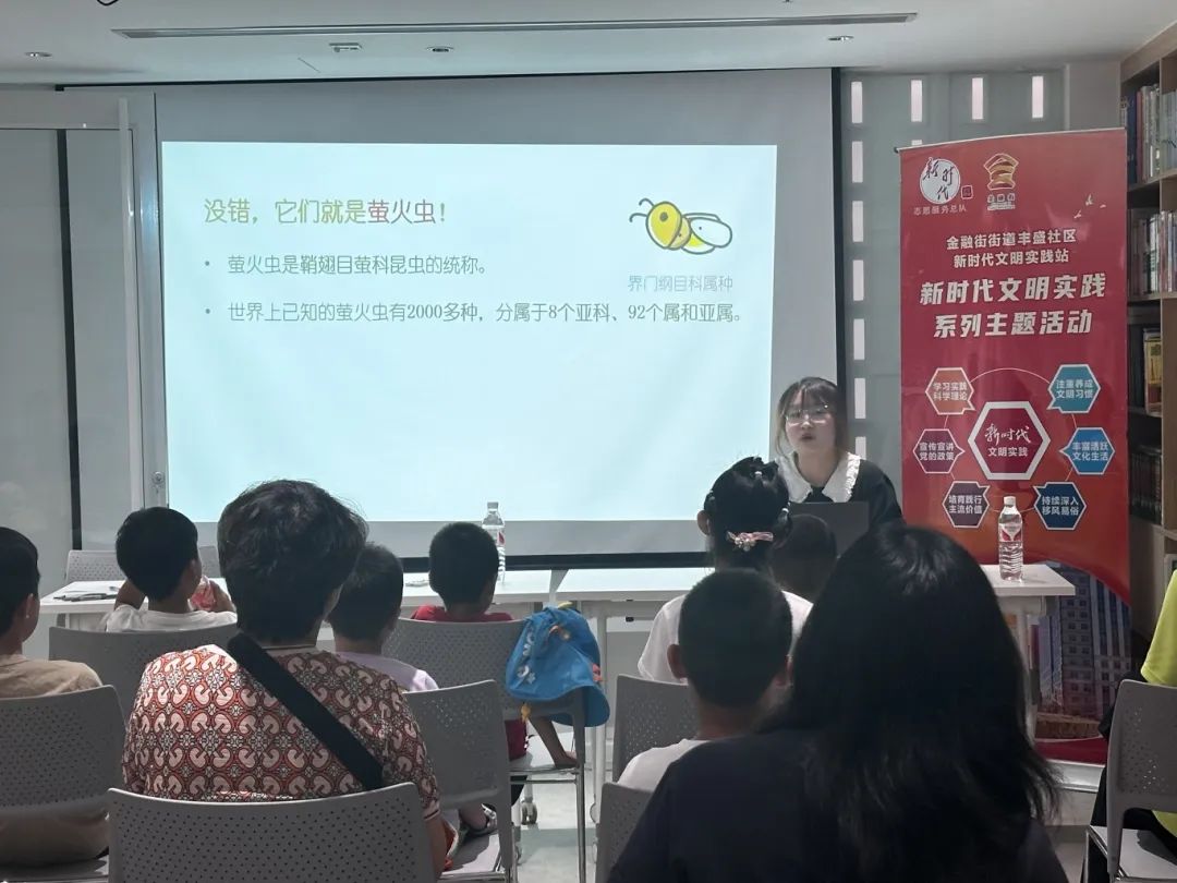 7月13日,马甫贺和魏莘烁同学一起为金融街丰盛社区的小朋友们带来了一堂科普课——《萤火虫为什么会发光》,为小朋友们介绍了萤火虫的身体结构、发光原理、生命周期、生存环境、捕食方式和面临的威胁等方面的知识。在讲解过程中,小朋友们都积极地回答问题和参与讨论,展现出对科学知识的浓厚兴趣。课程结束后,家长和小朋友们都表示这是一次生动、有趣、富有启发性的科普课堂。