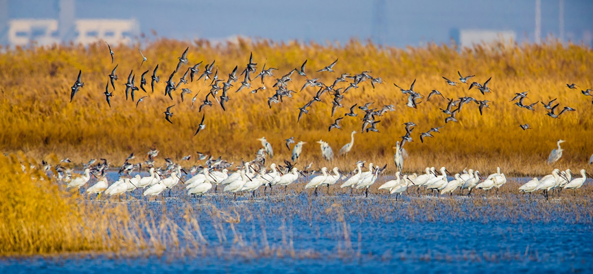 图2 渤海湾北大港湿地的迁徙水鸟及其栖息地(年爱军摄)