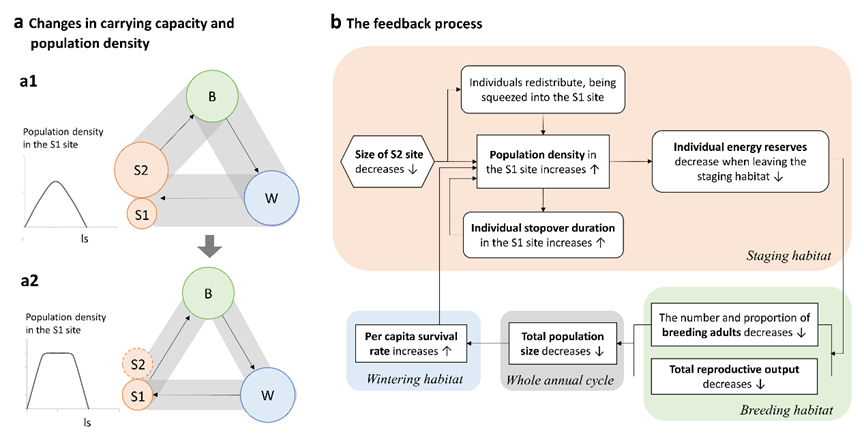 该研究通过构建一个包含程式化迁徙种群的基于个体的模型(individual-based model),首次提出了一个关于迁徙中停地的变化如何驱动候鸟个体停留时间和种群动态发生改变的假说,并通过分析我国渤海湾地区迁徙中停水鸟的调查数据对该假说进行了验证。研究发现,中停地的丧失会导致鸟类迁徙策略的改变,由于候鸟个体在中停地可获得的食物资源有所减少,它们会延长在中停地的停留时间以补充能量,由此引发中停期内候鸟种群密度的增长,从而对生活史周期内繁殖阶段和越冬阶段的种群动态产生了连锁反应。这是因为,迁徙中停地的丧失,不仅导致了整条迁徙路线上环境承载力的下降,也改变了候鸟生活史中对种群产生调节作用的阶段。